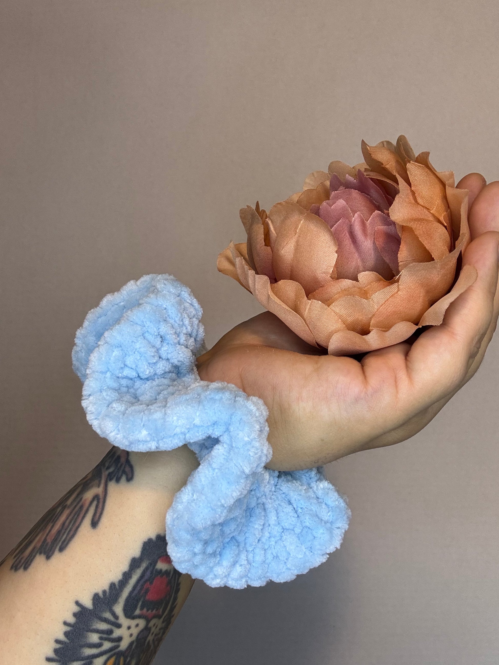 A cute light blue scrunchie crocheted with love! Soft and versatile for whatever style your heart says!