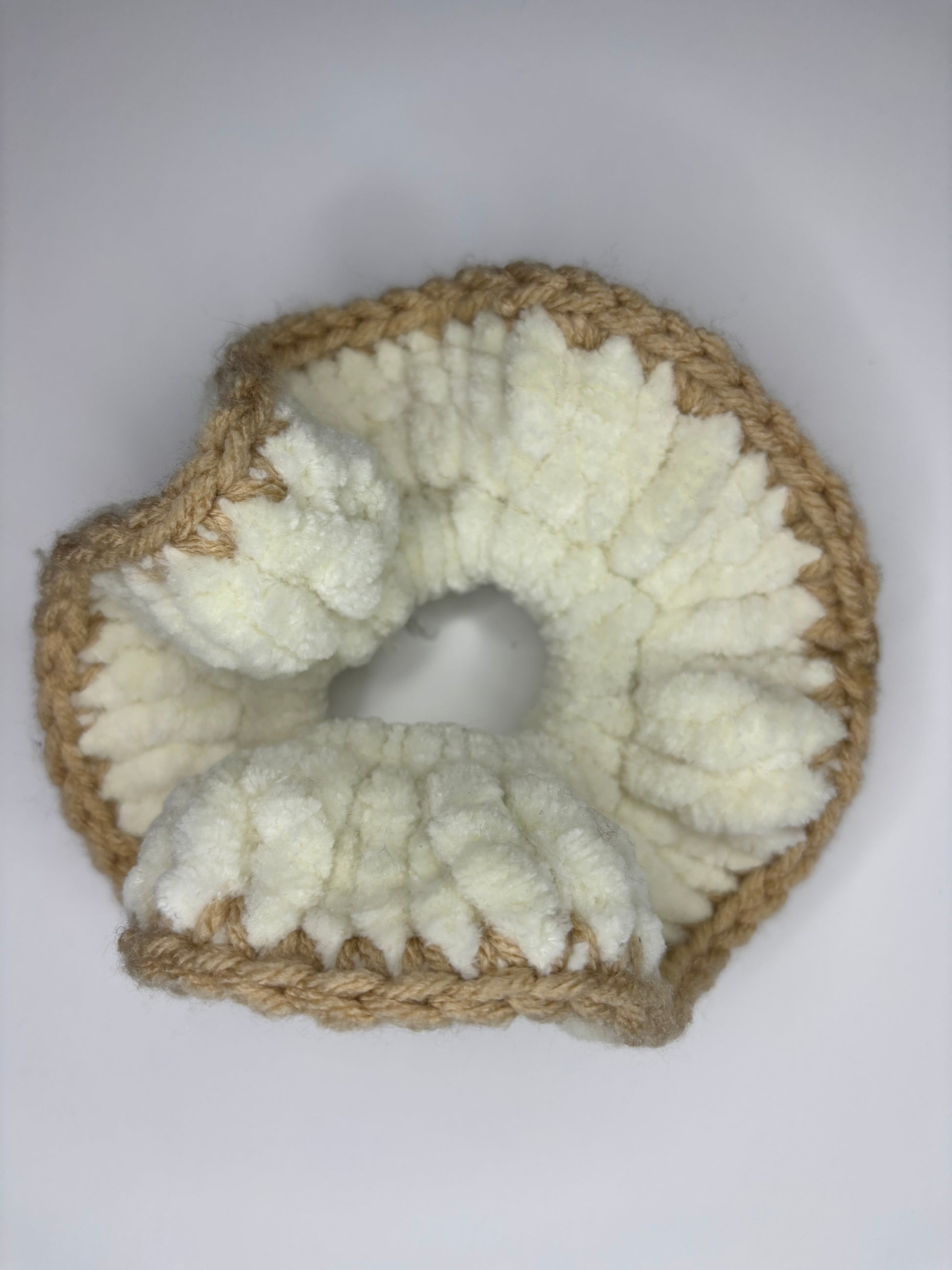 A fall themed scrunchie? Yes please! This cream with a light sandy brown boarder scrunchie is crocheted with love! Soft and versatile for whatever style your heart says!